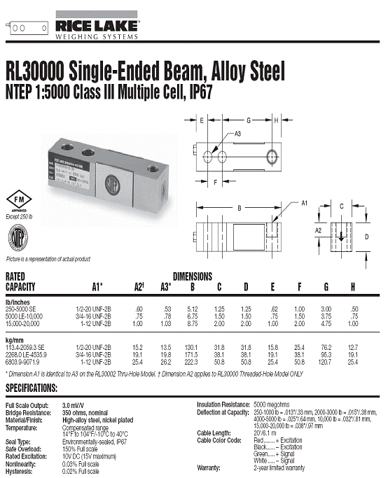 偏移量: 250-1000 lb = .013"/.33 mm, 2000-3000 lb = .015"/.38 mm,