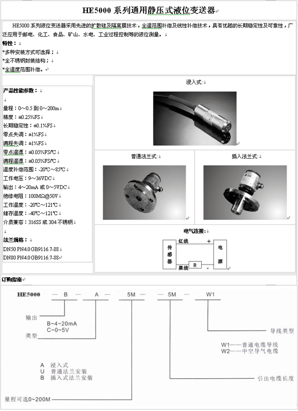 HE5000系列 液位變送器(pressure sensor):